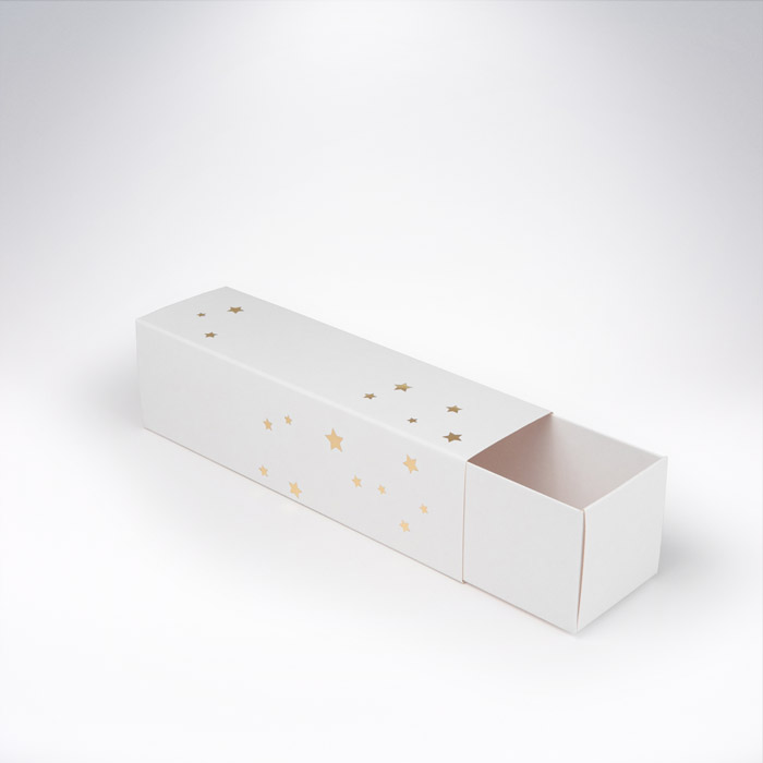 Makrónky samé o sebe majú svoje estetické farebné čaro. Keď ich ale správne skombinujete s krabičkou, stávajú sa ideálnym drobným darčekom. Bielu vysúvaciu krabičku z hladkej lepenky, ktorú už z našej ponuky poznáte, sme tentokrát vyšperkovali tak, aby zahviezdila a spolu s ňou aj jej obsah. Okrem makróniek ju môžete využiť aj na iné cukrovinky, rôzne drobné handmade výrobky, prírodnú kozmetiku, krémy či čaje. Ak sa chcete s krabičkou ešte o niečo viac vyhrať, odporúčame ozdobnú stuhu. Krabička na makarónky má atest pre priamy styk s potravinami. Makarónky alebo iné drobné cukrovinky do nej preto vkladajte spolu s pergamenovým papierom.