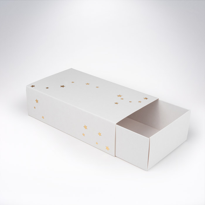 Krabička na makarónky v klasickom bielom prevedení doplnenom o zlatú razbu a motív hviezd. Čistý a elegantný obal na balenie makaróniek a drobných cukroviniek. Krabička je vyrobená z bielej pepieerovej lepenky a je vhodná na balenie cukrárskych výrobkov.