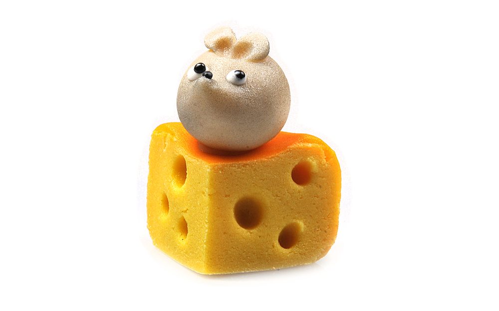 Jedlá dekorácie z marcipánu v podobe malej myšky sediaci na štvrťke ementálu.