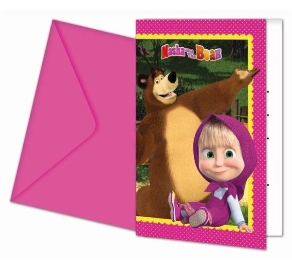 Pozvánky Máša a medveď – 6 ks Papierové pozvánky na oslavu s motívom Máša a medveď využijú dievčatá, aby pozvali svojich priateľov a spolužiakov na narodeninovú oslavu v tomto duchu. Pozvánky na večierok sú zabalené v sáčku, ktorý obsahuje 6 kusov.