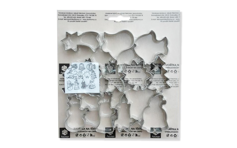 Vykrajovátko je vyrobené z nerezového plechu. Sada obsahuje 12 ks formičiek s vianočnou tematikou: kométa, zvonček, kapor, anjelici, čert, Mikuláš, sviečka, Santa Claus, snehuliak, stromček