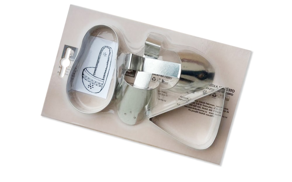 Sada obsahuje vypichovátka a formičky na pečení drobných tvarů, které po sesazení a slepení bílkovou polevou nebo čokoládou vytvoří pantoflíček. K jeho přípravě používejte nejlépe perníkové těsto.