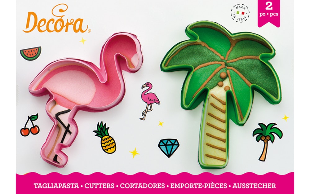 Sada 2 tropických vykrajovátek pro letní dortík! Vykrajovačky plameňáka a palmy jsou vyrobeny z plastu a mohou být použity na sušenky, marcipán, fondant a mnoho dalšího! Vesele zabalené na barevné pozadí!