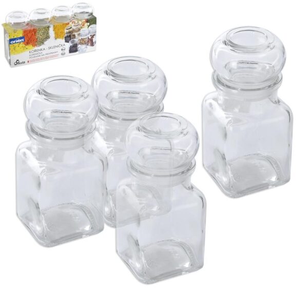 Korunka s vekom so silikónovým tesnením. Korenie skladujte prehľadne, bez straty chuti a vône. Sada 4 kusov. Materiál: sklo. Rozmery: objem 120 ml, 5,5×5,5×10 cm. Nádoba na korenie s viečkom so silikónovým tesnením. Korenie skladujte prehľadne, nestratí chuť ani vôňu. Sada 4 kusov. Materiál: sklo. Rozmery: objem 150 ml, 5,5×5,5×12 cm.