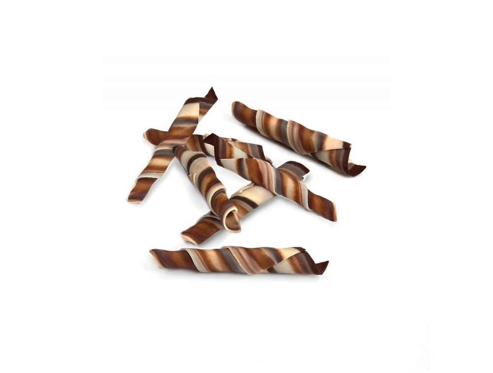 Čokoládová dekorace v podobě jemných kónicky vinutých trubiček v mramorovém provedení, délka 55 mm tloušťka v nejširší části 6 mm. Protože výrobek není kalibrován, jedná se o rozměry informativní.