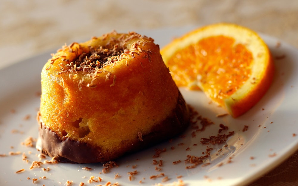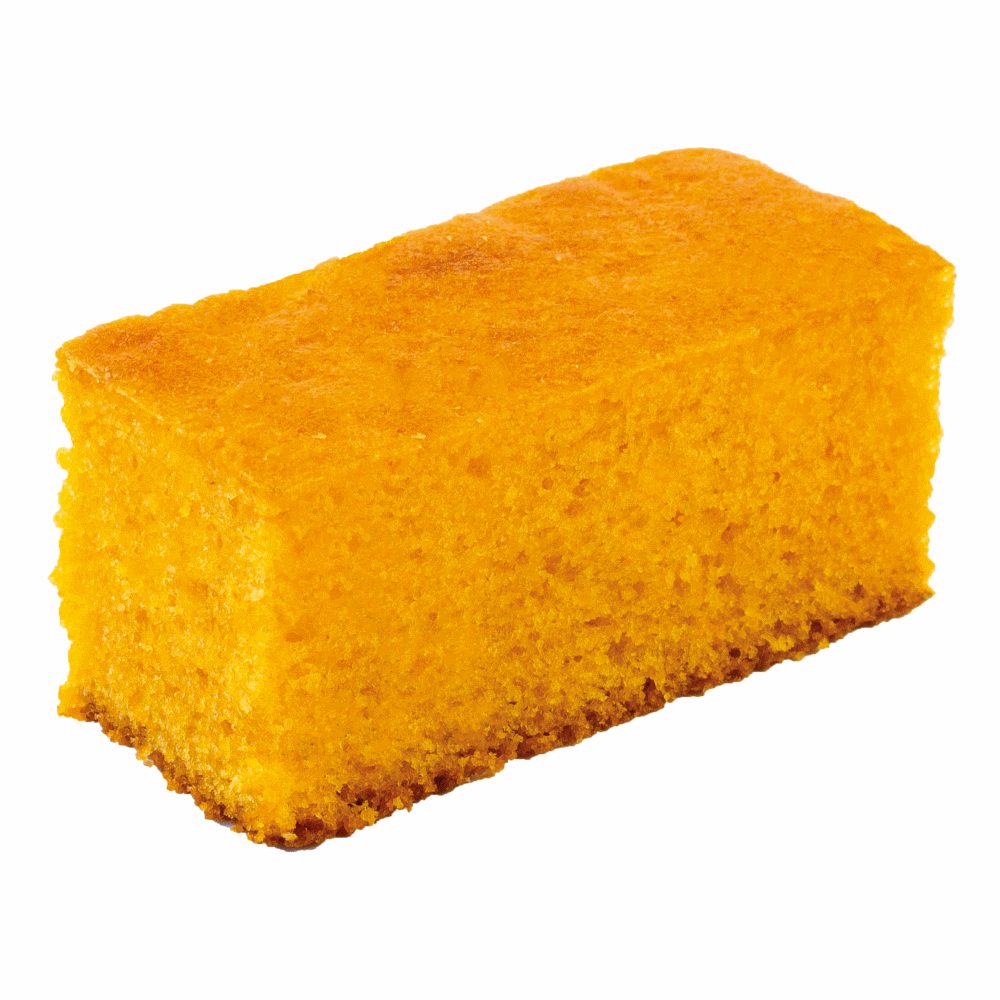 Zmes na výrobu vláčneho piškótového múčnika s pomarančovou príchuťou v svetlooranžovej farbe.